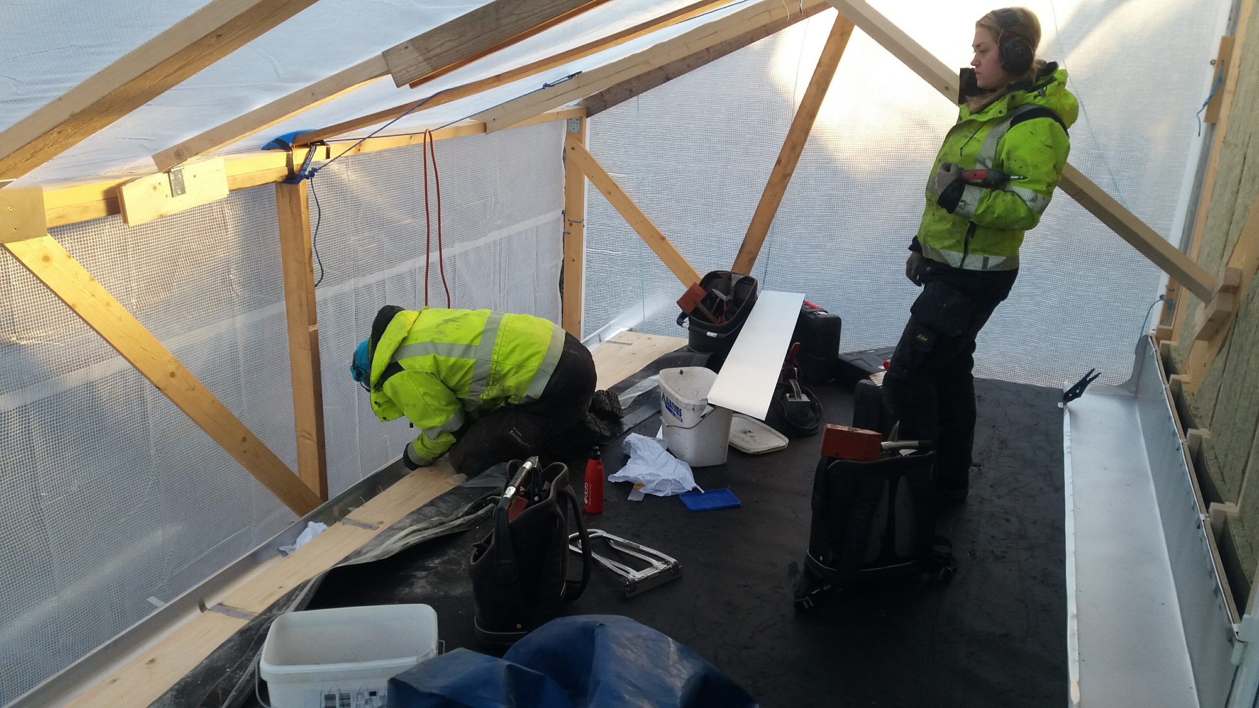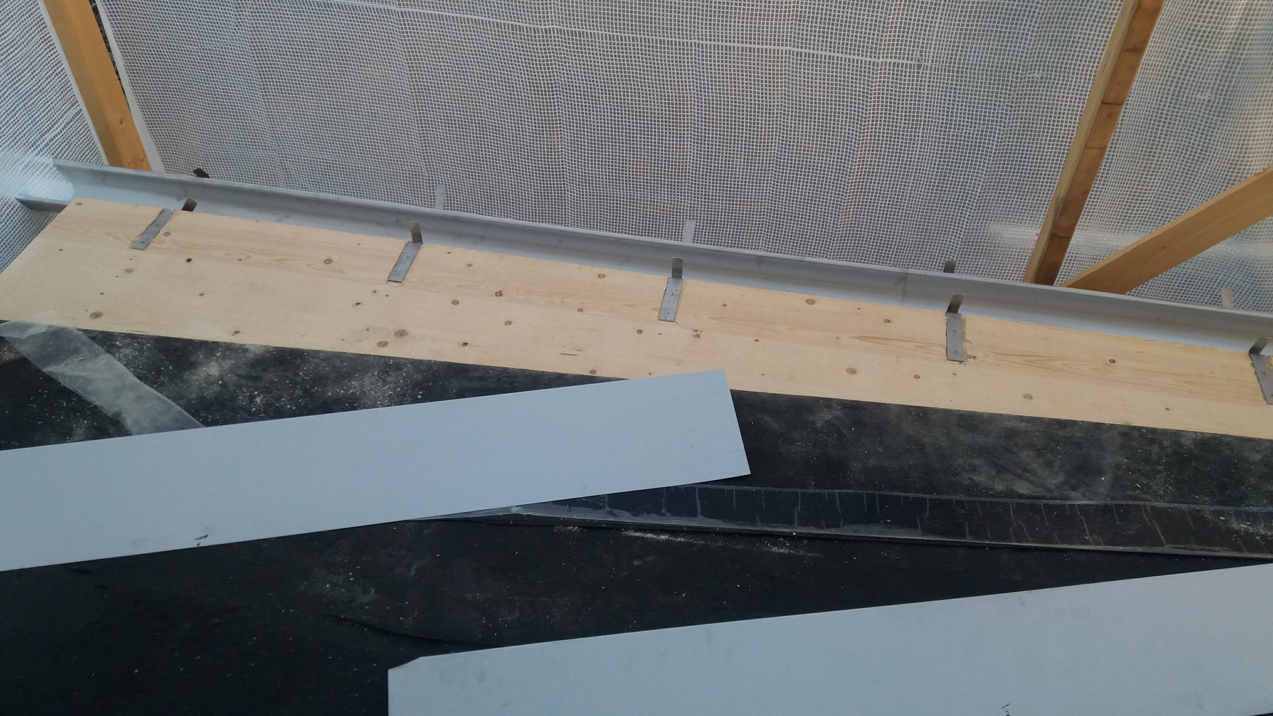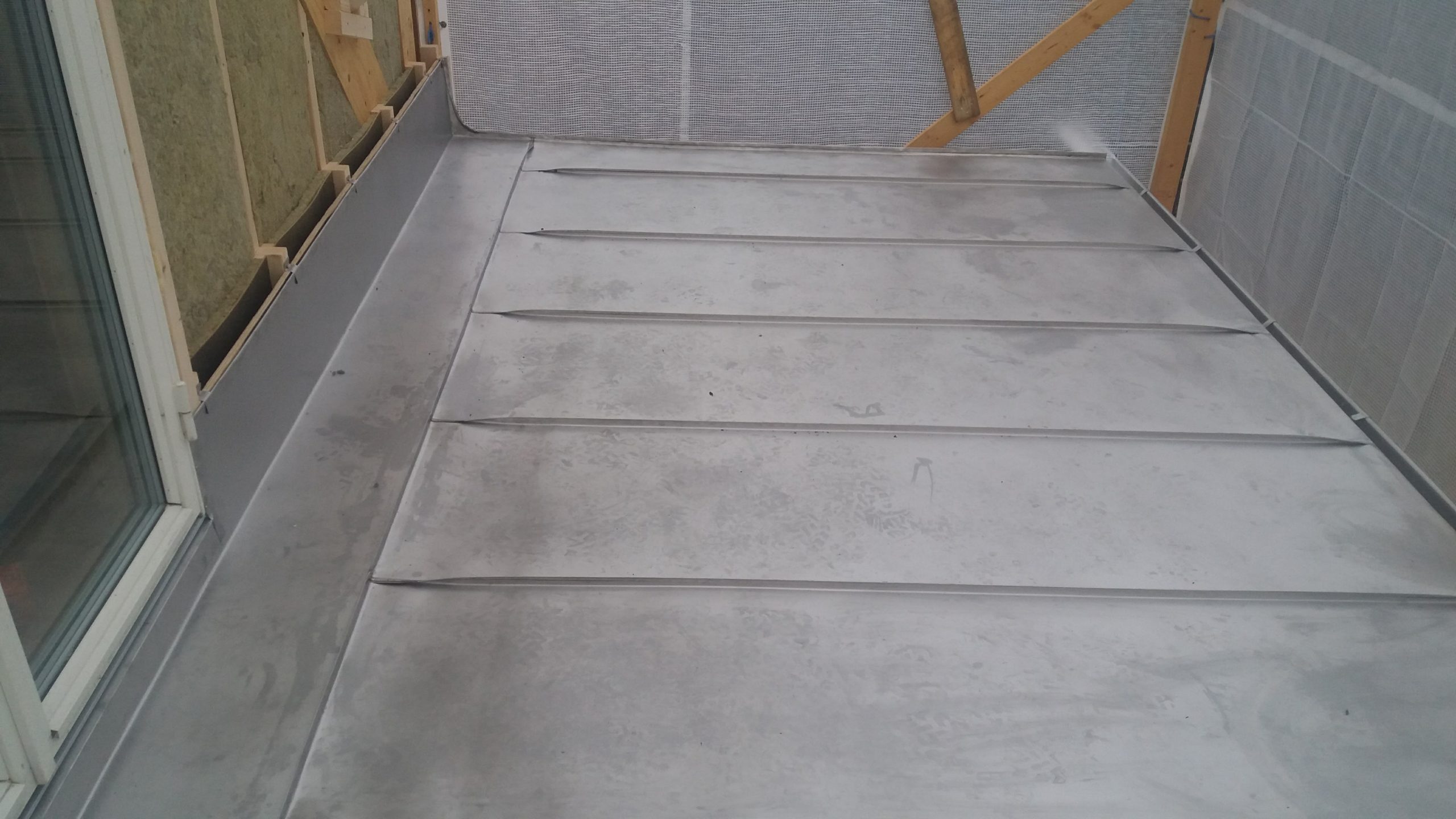 Terrass i sömsvetsad syrafast rostfri plåt från Outokumpu. Tjocklek 0,4 mm kvalitet EN1.4404 yta DekorMatt. DekorMatt är en mattvalsad yta, hängränna i samma matta material.